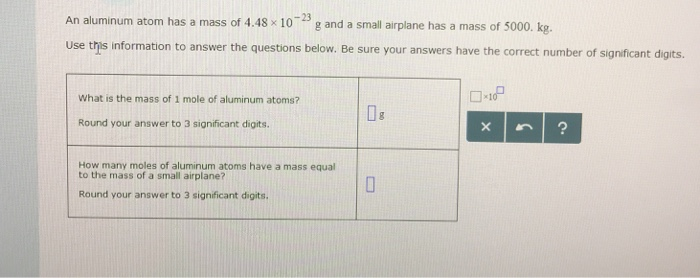 Answered: How many protons, neutrons, and… | bartleby from prod-qna-question-images.s3.amazonaws.com Given there are a number of aluminum products, i will address a few: Thus the number of moles of aluminum oxide is computed as: How many aluminum atoms are there in 319 g of {eq}al_2s_3 {/eq}? How many aluminum atoms are in 3.78 g of aluminum? The unit used here is the unified atomic mass unit, u. So, the conversion of carbon from grams to atoms is given by = 10(1/12)( 6.02 x 10 23) = 5.02 x 10 23 As you know, one mole of any element contains exactly 6.022⋅1023 atoms of that element. How many aluminum atoms are in $3.78 \mathrm{g}$ of aluminum?