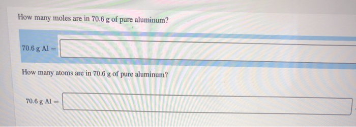 Solved: How Many Moles Are In 70.6 G Of Pure Aluminum? 70 ... from media.cheggcdn.com And to determine the number of atoms we essentially multiply. So essentially, we know what the mass off silver was given. This question hasn't been solved yet ask an expert ask an expert ask an expert done loading. We know that the molar mass of 1 mole of carbon is equal to 12. That means that 12 g of almath_2[/math. The mill, um, eyes, we can look up from the period of table, and that is 107 0.87 grams per mole. How many atoms are in 16.9 g sr? This means that if you know how many moles of aluminium you have in #4.55 g#, you can use avogadro's number to find the number of atoms.